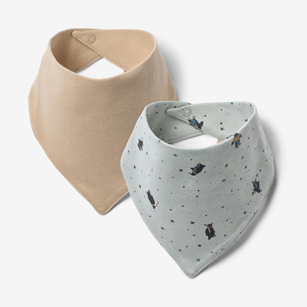Practical set of two bibs in soft organic cotton for babies.- Press buttons at the neck- One in Wheat signature print- One in a solid colourWheat’s cute bibs are unisex and a true essential in your baby’s wardrobe. The bib has adjustable press buttons at the neck and is comfortable for your baby to wear.
