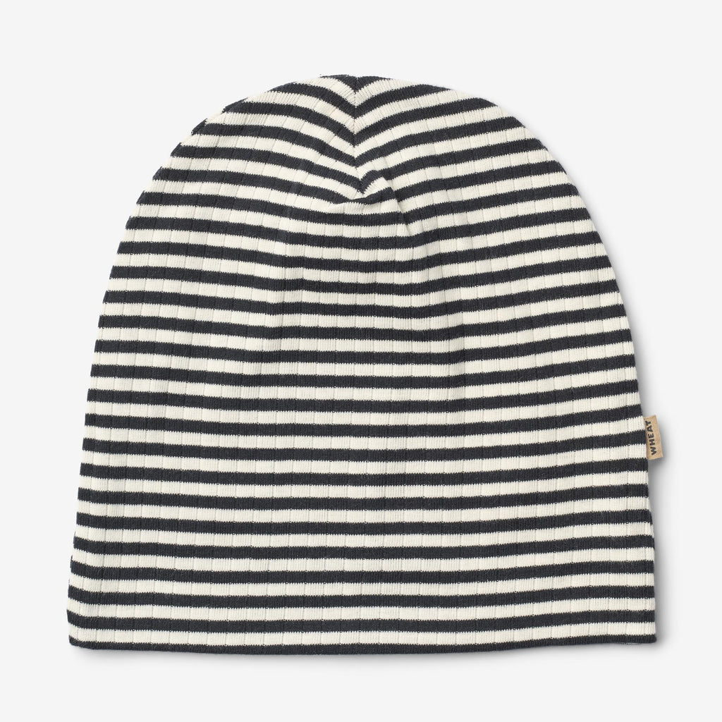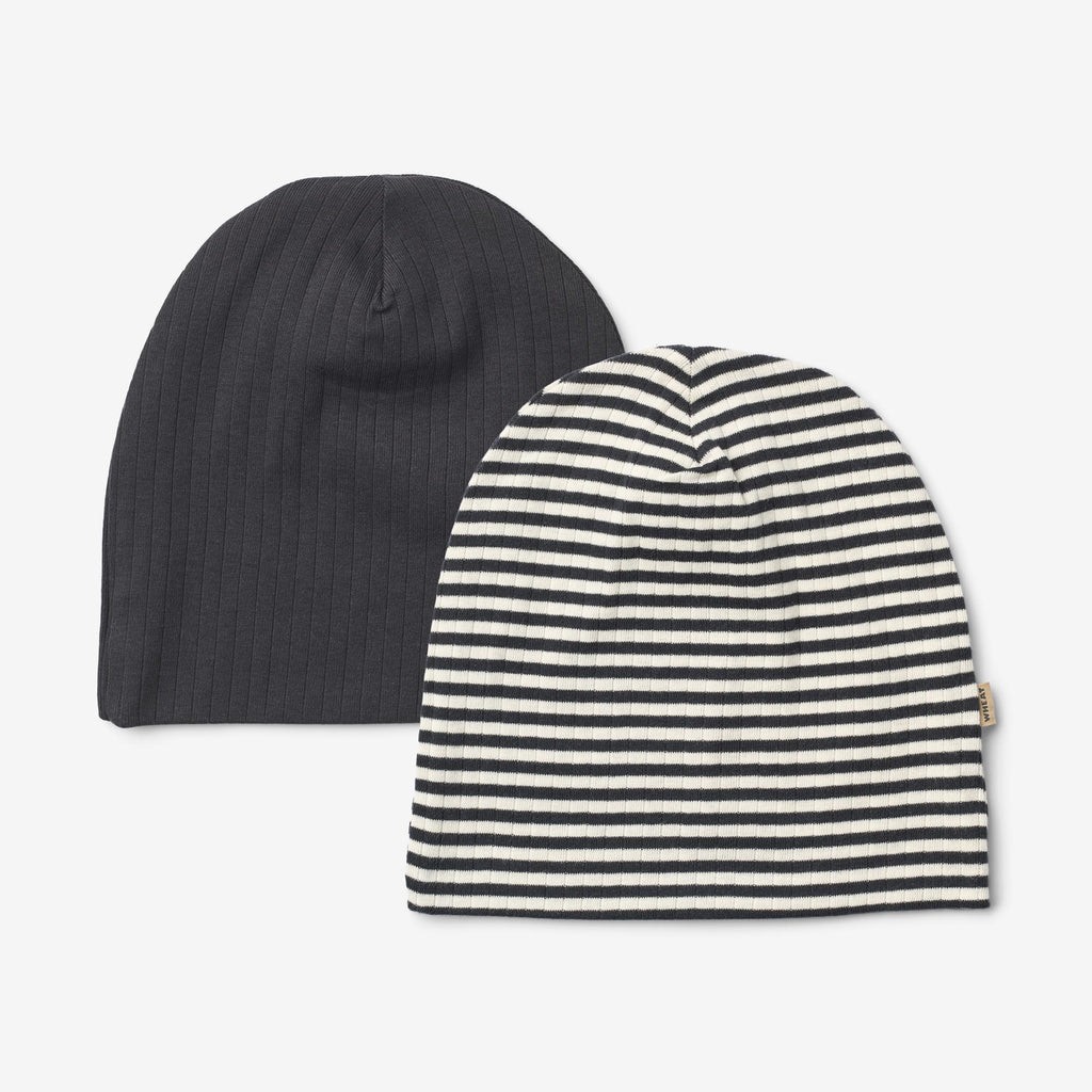 Set of two soft hats in organic cotton for children.- One in a solid colour- One with stripesThese soft hats are both comfortable and practical to keep the wind at bay. The hat can be folded to the length that fits your child best.