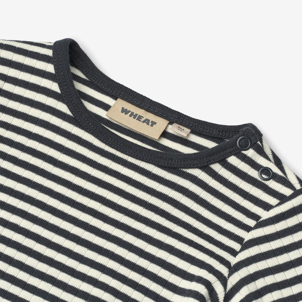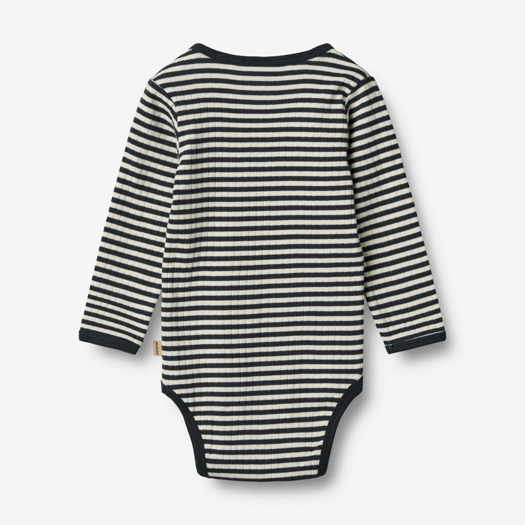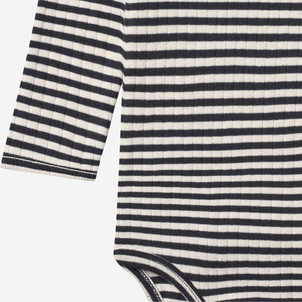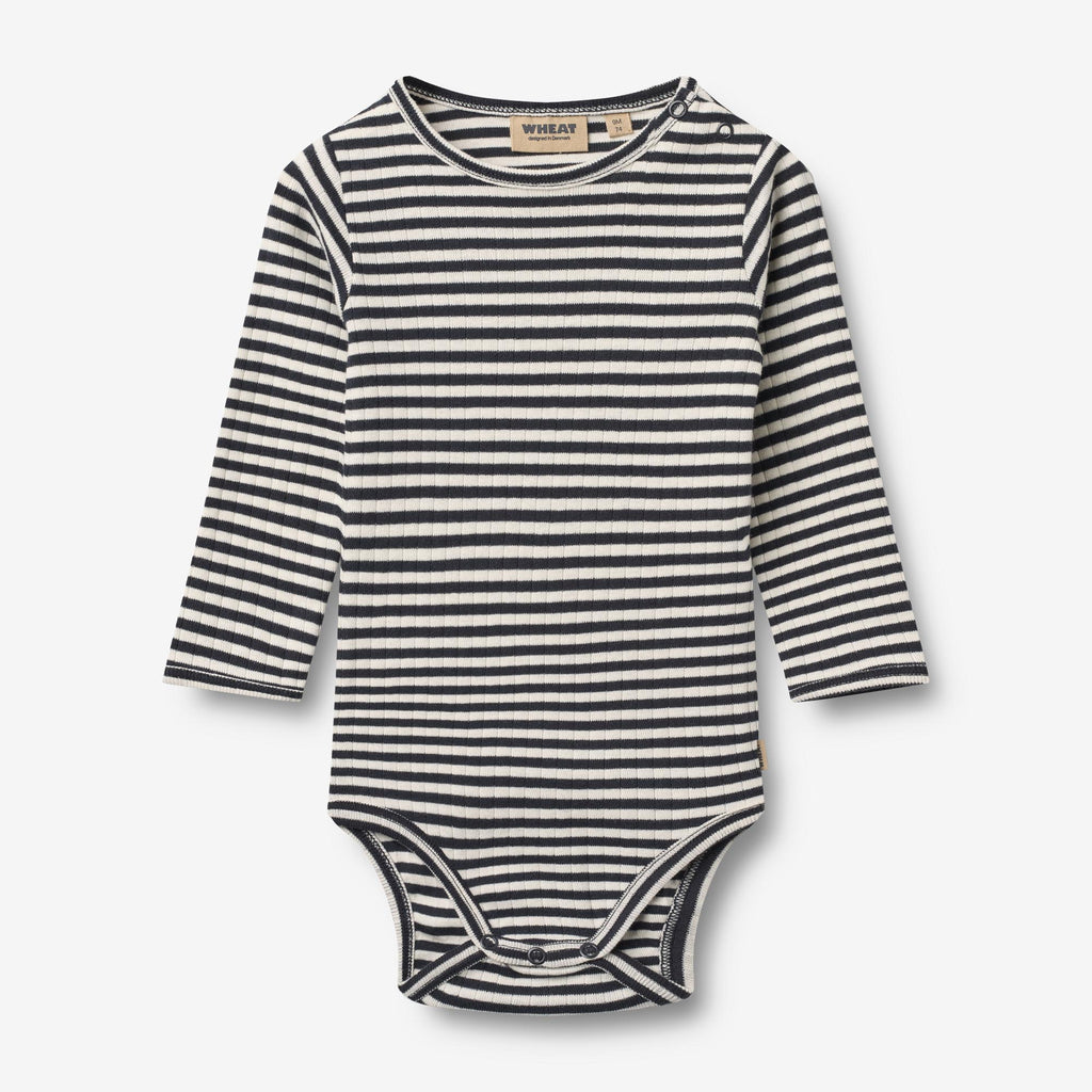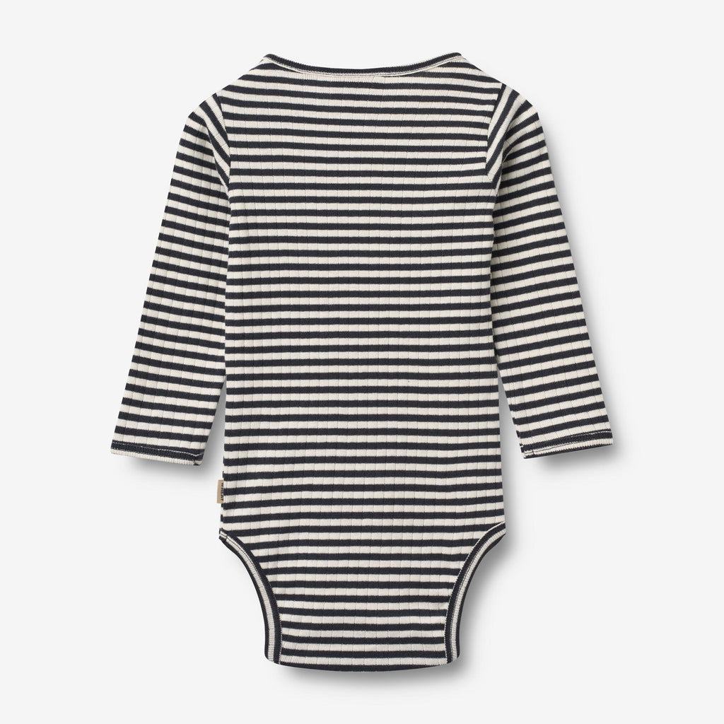 Long-sleeved body with stripes in soft organic cotton for babies.- Press buttons at the shoulder and crotch- Rib at the neckline, sleeve and bottom hem in contrast colour- StripedThis body is unisex and a true essential in your baby’s wardrobe, as it can be worn on its own or as an extra layer underneath everyday clothing. The bodies either have press buttons at the shoulder or buttons at the neck for better comfort, when you are dressing your baby.