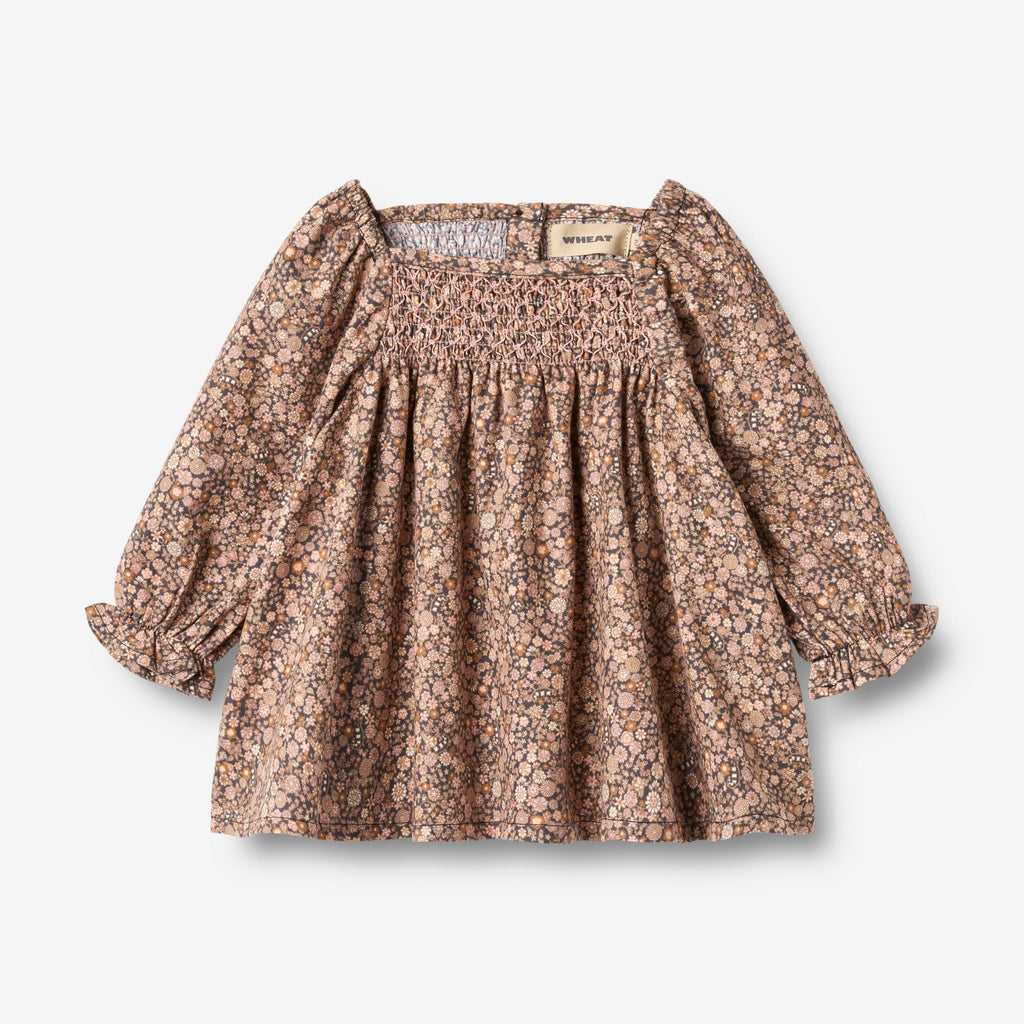 Lovely long-sleeved dress with smock detail made from soft organic cotton for your baby. - Square neckline- Wide smock panel across the chest- Fitted shape at the smock section- Long puffed sleeves with narrow elastic at the shoulders- Elastic with pleats and volume at the wrists- Cutline at the waist with pleats and a flared skirt- Buttom closure at backWheat's dresses are designed to be comfortable and should be a staple in your child’s wardrobe. They can easily be dressed up or down depending on how you style the outfit.The smock detail ensures a close fit around the upper body, while the gathered waist adds volume to the skirt. All in all, a lovely dress for the many events of the autumn season.