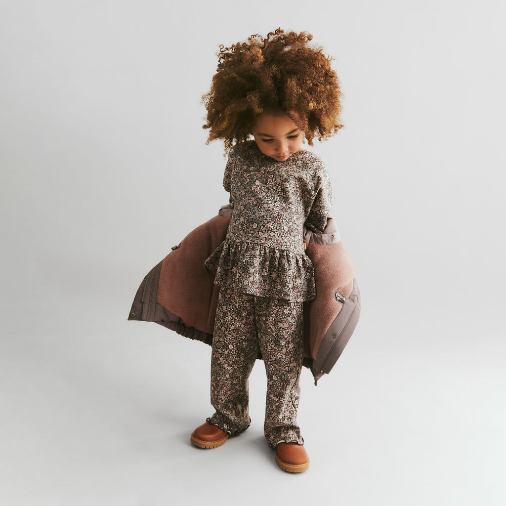 Comfy printed jersey pants in soft organic cotton for children.- Regular/loose fit- Wide legs- Adjustable elastic at the waist- Wheat signature printWheat's lovely soft pants are both cute and comfortable for your child to wear and can easily be styled under one of our dresses or with a T-shirt or knit. The soft pants have a relaxed fit at the top and becomes wider further down the leg.