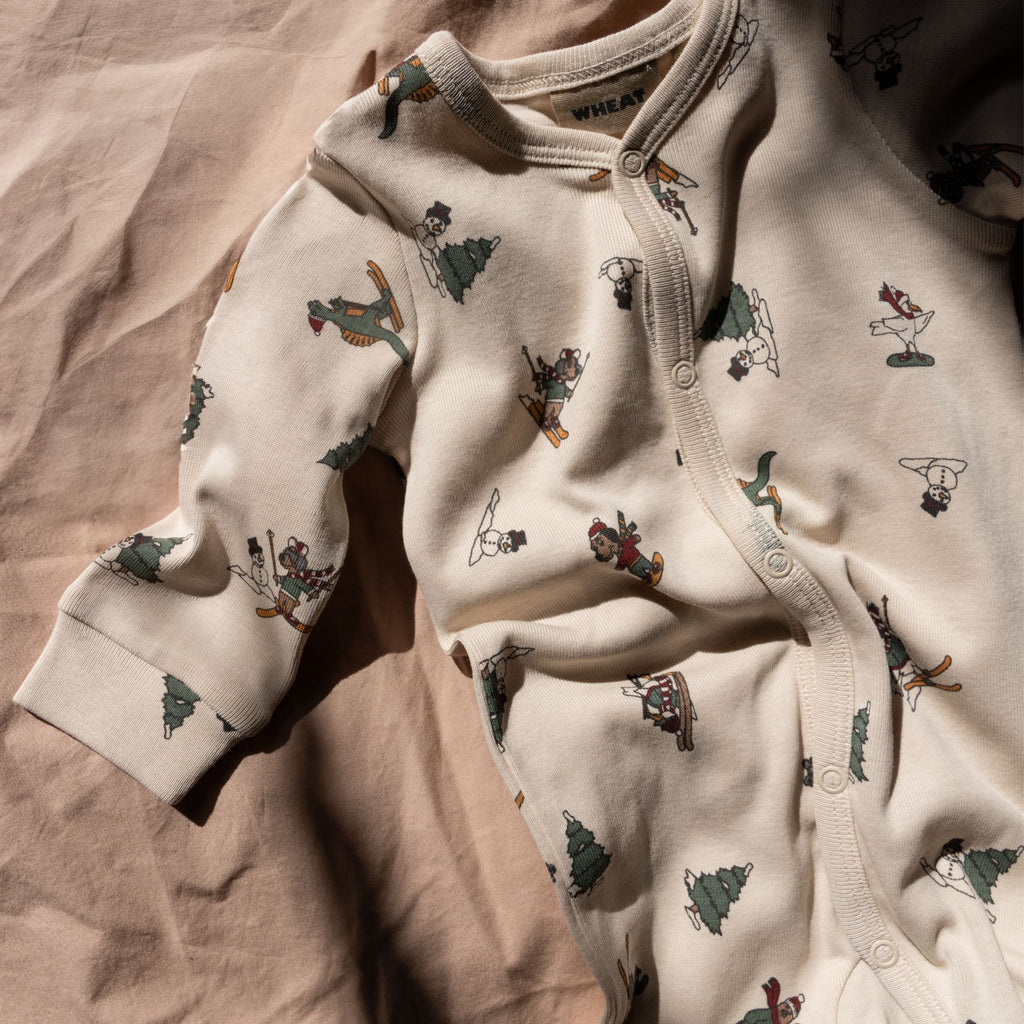 Long-sleeved jumpsuit in soft organic cotton for your baby. - Regular/loose fit- Press buttons down the front and along the inseam- Whreat signature print with Christmas motifsWheat's jumpsuit for babies is both cute and comfortable. The jumpsuit has press buttons at the shoulder or down the front and along the inseam of the legs, which makes it easier for you to dress your baby. The jumpsuit can be worn on its own or as an extra layer underneath everyday clothing.