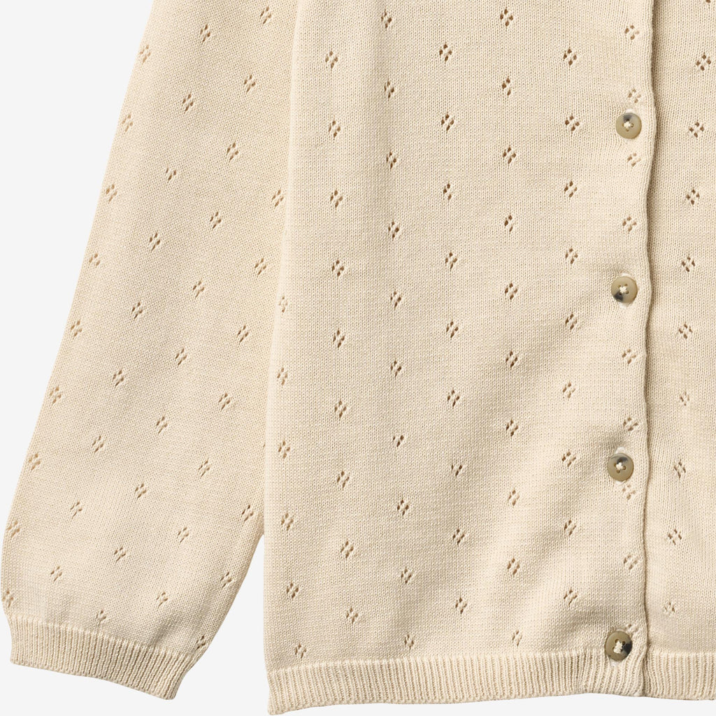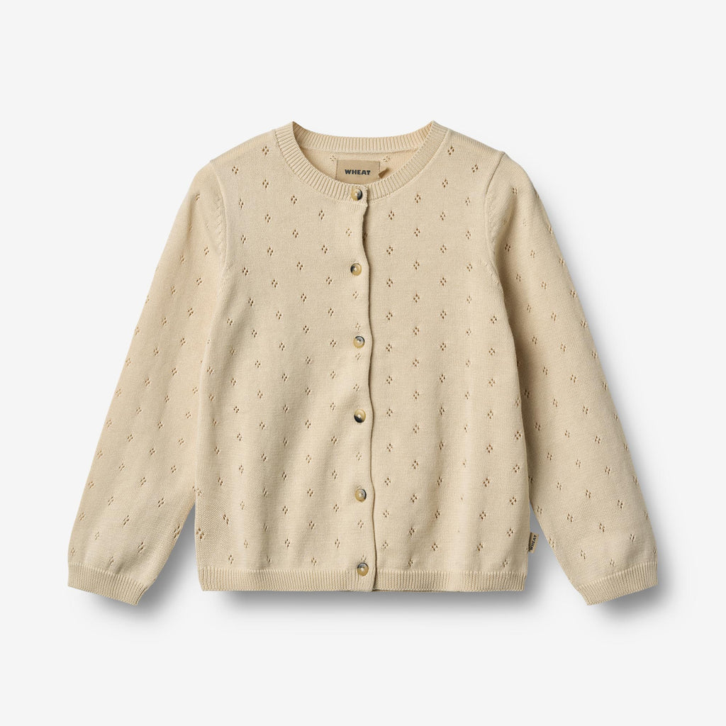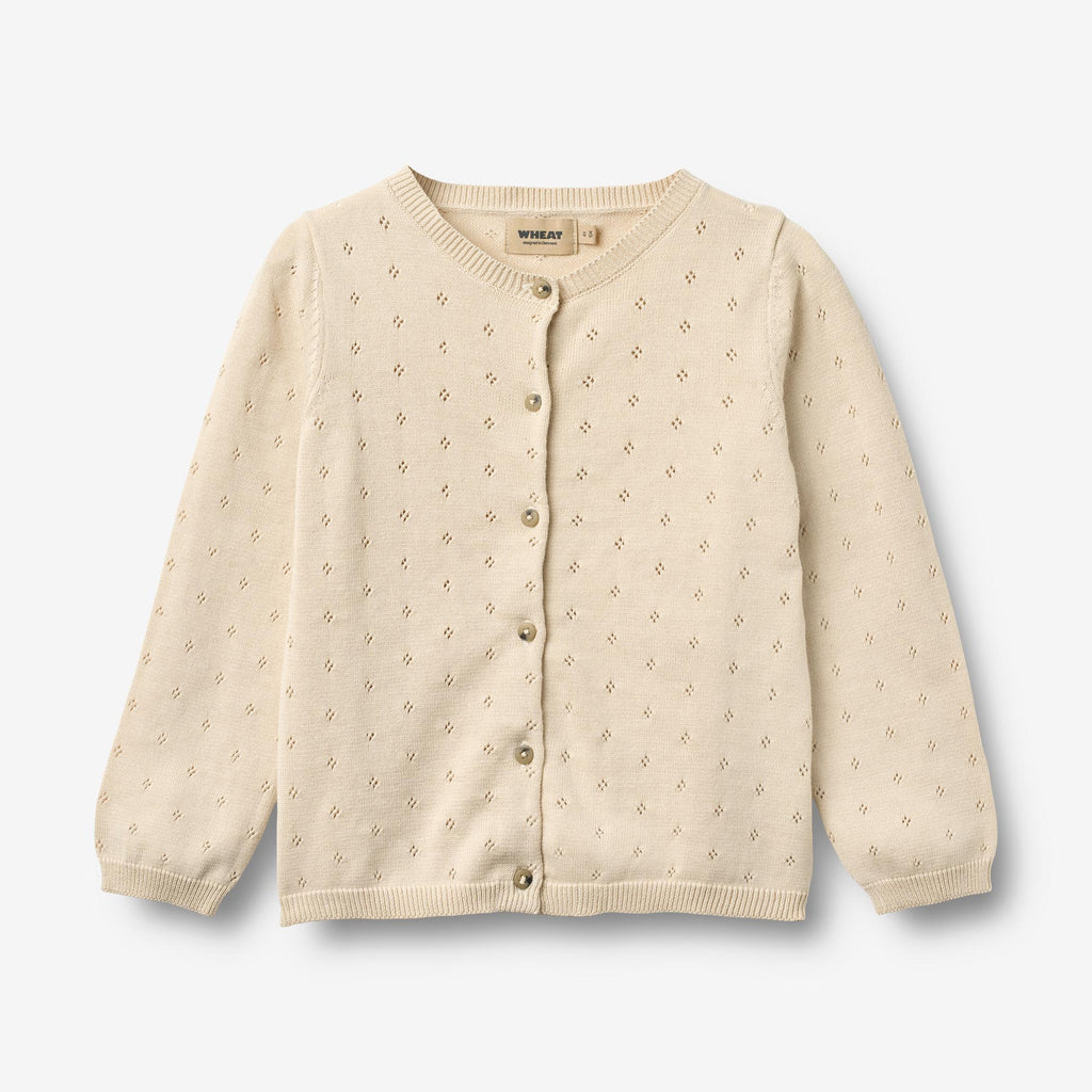 Bestseller Knit Cardigan Maia in organic cotton for your child.- Overlock stitching used in garment construction- Button closure- Available in sizes 3 years to 12 years- Unique knitted patternThe Knit Cardigan Maia is crafted from soft, organic cotton, making it a comfortable and versatile layering piece for any season. Its classic design and button-front closure make it easy to pair with a variety of outfits.Perfect for layering over a Wheat T-shirt or under a jacket on cooler days, this cardigan is a practical addition to your child's wardrobe. The bone button closure adds a touch of detail while ensuring a secure fit.
