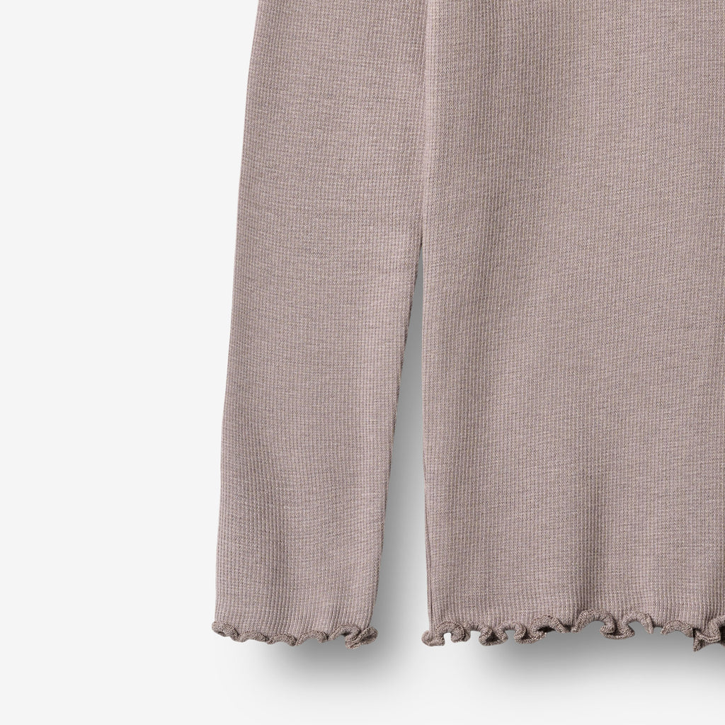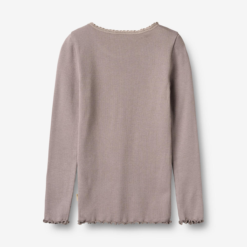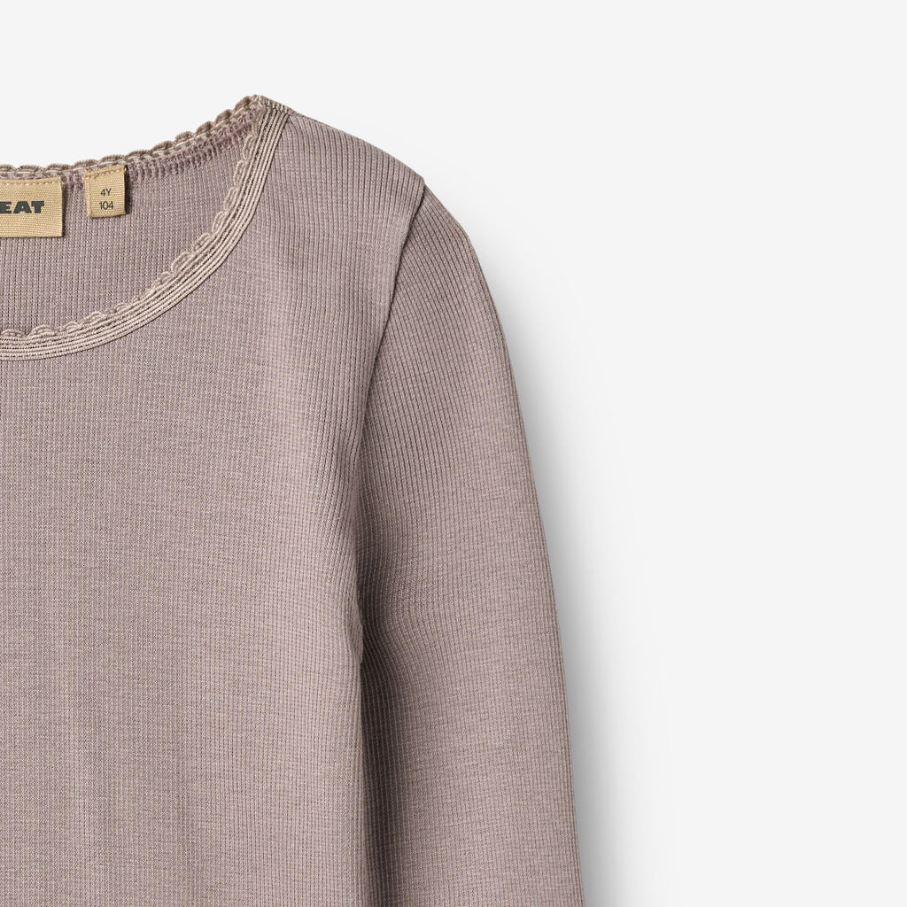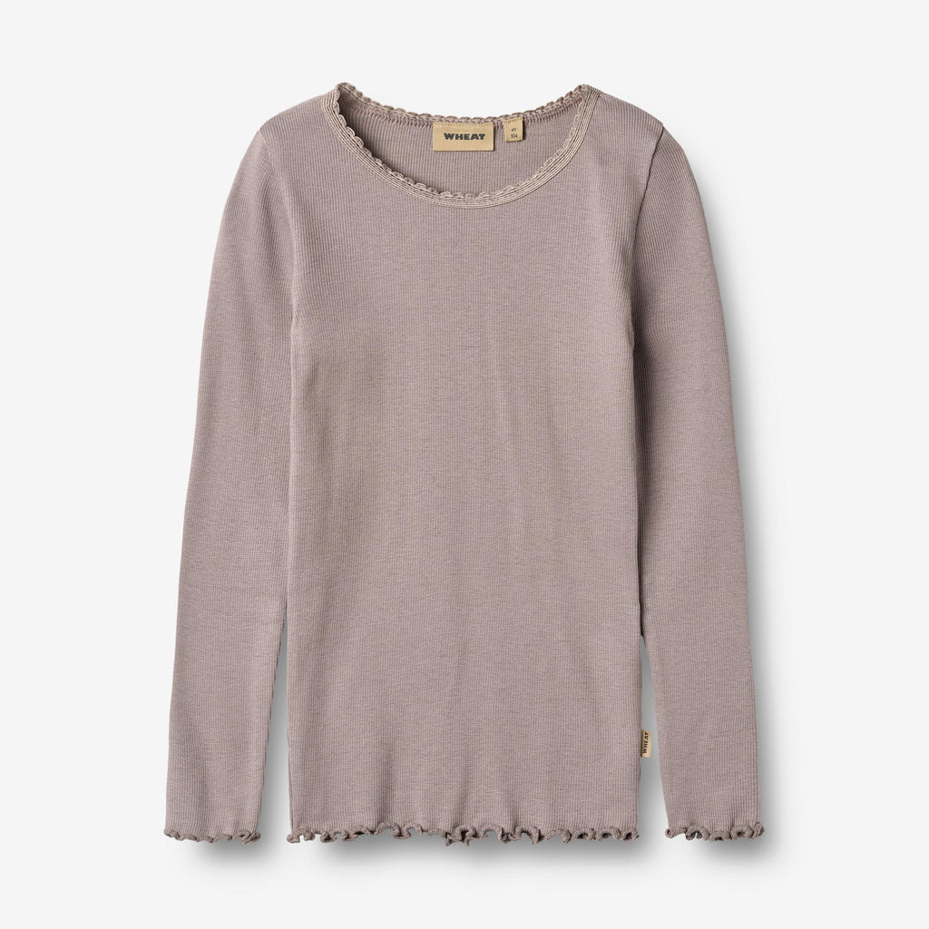 Rib t-shirt with long sleeves in a soft modal and organic cotton blend for your child.- Rib construction- Babylock finish on sleeve and bottom hems- Overlock finish on backside- Available in multiple coloursThe Rib t-shirt long-sleeve T-shirt Reese is crafted from a blend of modal and organic cotton, offering a soft and comfortable feel against the skin. This long-sleeved t-shirt is ideal as a base layer during cooler seasons or as a standalone piece in milder weather. The simple design makes it easy to pair with other Wheat items for a complete and comfortable outfit.The t-shirt features a rib construction for a flexible fit, while the babylock finish on the sleeve and bottom hems adds a subtle design detail.