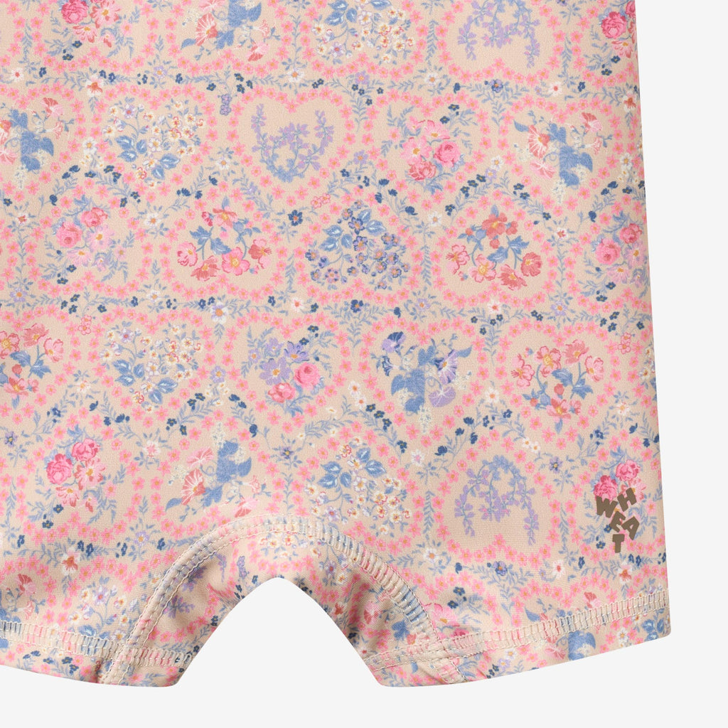Practical unisex swimsuit with print and short sleeves and legs for babies.