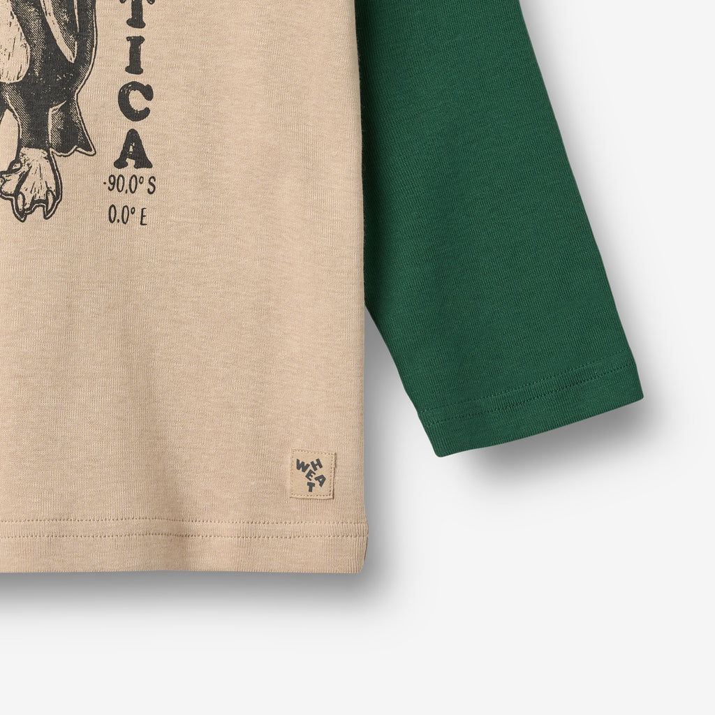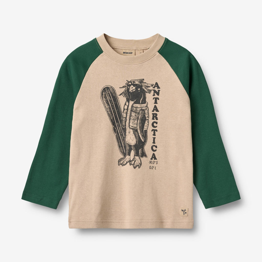 Long-sleeved t-shirt with front print in soft organic cotton for the junior child.- Regular/loose fit- Neckline and raglan sleeves in a contrast colour- Wheat signature front print Wheat's T-shirts are a true essential in your child’s wardrobe, as the T-shirts are soft and comfortable for your child to wear. They can easily be styled with pair of trousers or a skirt, and with a knit on top depending on the weather and occasion.