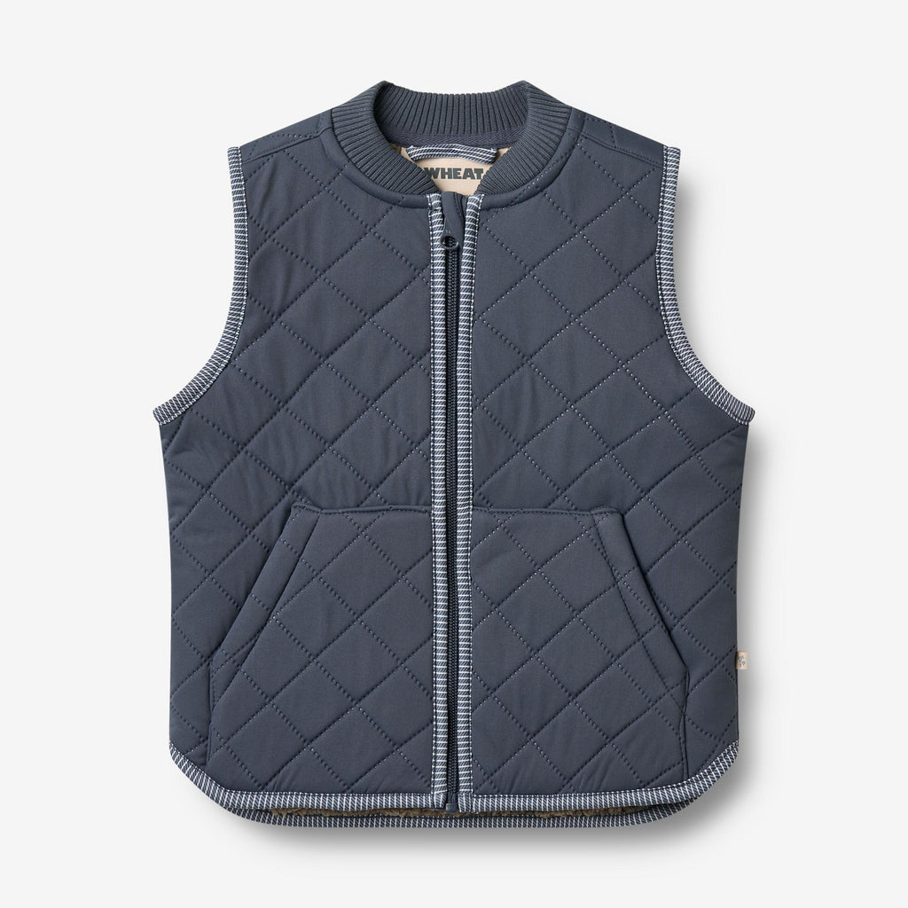 Our cozy pile-lined thermo vest for children. - Regular fit- Fully lined with pile- Rib collar- Shoulders moved forward at front- Cutline at back- Kangaroo pockets- Zipper with chin guard at placket- Reflective badge at back- Edgebands with contrast printWheat's popular thermo wear for children is a true everyday favourite, as the soft and lightweight material makes it comfortable to move and play in. The thermo vest is produced in 100% recycled polyester and can be used as a cozy layer indoor and as practical transitional outerwear. It is not waterproof but is water repellent and is suitable for the damp autumn weather.Wheat's thermo vest can easily be styled with a knit or another jacket underneath to create a cool layered look.