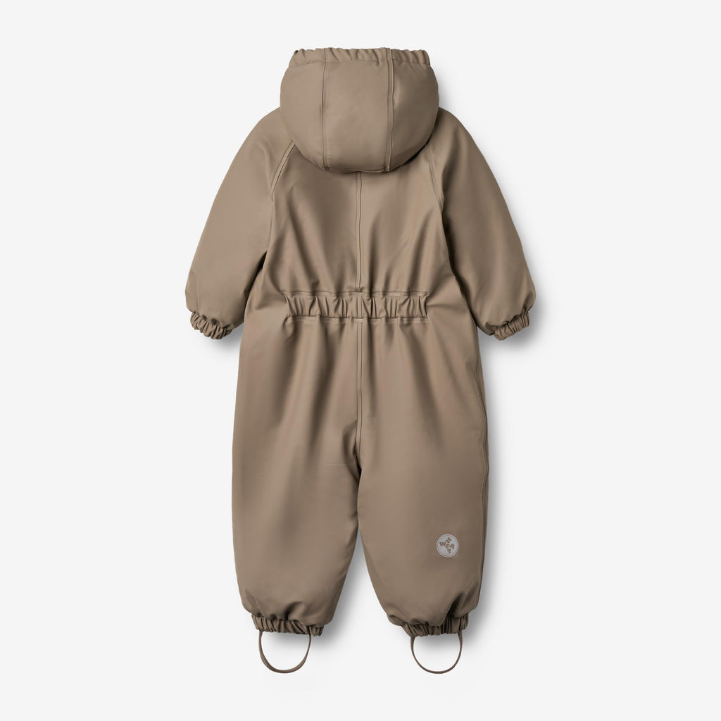 Waterproof puffer wintersuit in recycled polyester with featherless insulation for your baby.- Thermo rainwear with PU coating- Soft 2x2 rib details- Soft 100% recycled fleece lining- Aquaguard zipper with puller- Adjustable strap on hood with velcro closure- Rubber strap at footWheat's Wintersuit Evig is crafted from a durable, waterproof thermo rainwear material with a soft fleece lining, making it ideal for cold and wet weather. The suit is designed to provide warmth and protection while allowing your child to move freely during outdoor play.The suit features practical details such as an Aquaguard zipper for easy dressing and a secure closure. The adjustable hood and rubber straps at the feet ensure a snug and comfortable fit, keeping your child warm and dry. Pair with our Puffer Baby Booties Fuffa for extra warmth.