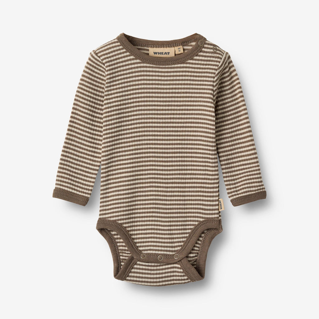 Striped long-sleeved body in soft merino wool jersey for your baby. - Regular/slim fit - Press buttons at the left shoulder and crotch- Contrast details for a refined look- Striped woolWheat’s wool wear is specially designed to keep your child warm in the cold weather, while still keeping them from overheating, as wool has the unique quality that it helps regulate body temperature. The wool styles are great for layering and soft on bare skin.Wheat’s body is unisex and a true essential in your baby’s wardrobe, as it can be worn on its own or as an extra layer underneath everyday clothing. The bodies either have press buttons at the shoulder or buttons at the neck for better comfort, when you are dressing your baby. The body also has press buttons at the bottom, which makes it easier for you to access your baby’s diaper.